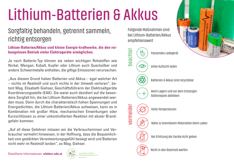 Geräte, die durch Akkus/Batterien gespeist werden, sollten, wenn sie kaputt und nicht mehr reparierbar sind, zu einer der rund 2.000 Sammelstellen Österreichs gebracht werden. Dort können sie während der Öffnungszeiten unbürokratisch und kostenlos abgegeben werden. Achtung: Bevor Sie Ihr Elektrogerät zur Sammelstelle bringen, entfernen Sie bitte die Akkus/Batterien, da diese gesondert verwertet werden. Übrigens können alte Elektrogeräte beim Kauf eines neuen, gleichwertigen Geräts auch bei größeren Handelsgeschäften zurückgegeben werden.