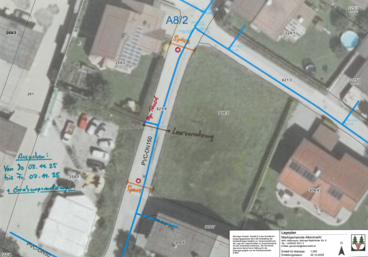 Von 03.11.2025 bis 07.11.2025 finden im Bereich der Stampfergasse zwischen den Liegenschaften Mühlbachweg 8 (Zimmerei Bliem) und Stampfergasse 7 Arbeiten an der öffentlichen Trinkwasserversorgung statt. Im Rahmen der Grabungsarbeiten wird eine Straßensperre nach den Objekten Stampfergasse 4 bzw. 6 notwendig. Eine Umleitung ist über die Gemeindestraßen Saliterergasse, Grubgasse und Neuwirtsgasse möglich.