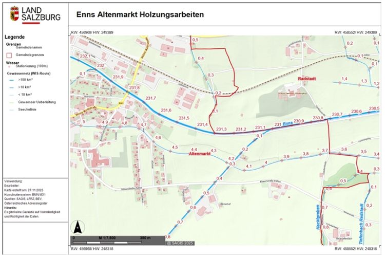 Von 01.12.2025 bis 07.12.2025 ist der Ennsradweg zischen der Ennsbrücke auf der Ortsdurchfahrt und der Tandalierbrücke aufgrund von Holzungsarbeiten gesperrt.